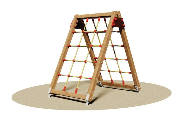 Realizzata in legno di pino nordico impregnato in autoclave con sali atossici. Composta da due moduli sartia inclinati e collegati lateralmente da due pannelli sagomati in multistrato di mogano okoumé ad incollaggio fenolico trattati con impregnazione colorata e finitura con vernici atossiche a base di cera diluibili ad acqua. Ogni modulo sartia é realizzato con telaio di pali a sezione quadrata cm 7x7 e rete con funi in nylon con anima interna in cavo di acciaio rivestito. La rete è assemblata e collegata al telaio da speciali bloccacorda in nylon colorato. Assemblaggio mediante bulloneria in acciaio zincato 8.8 e dadi autobloccanti. Elementi copridado a norma in nylon colorato. Attacchi in metallo zincato a caldo per l’ancoraggio al suolo.